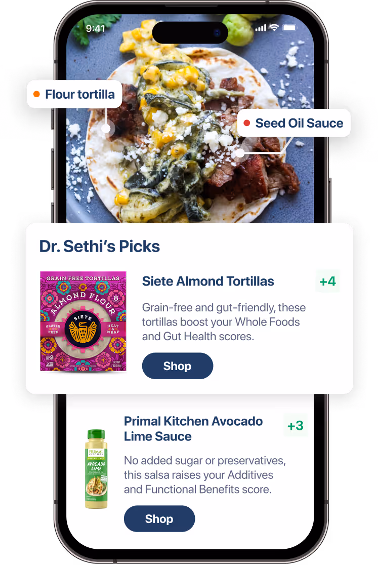 Instantly see smarter swaps when your food scores low. Discover Dr. Sethi’s Picks and clean alternatives that boost your score without giving up flavor.