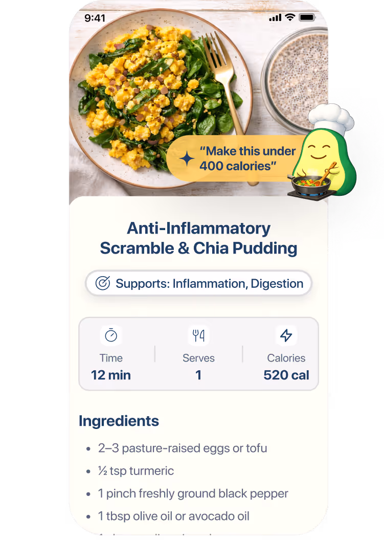 Turn guidance into simple, personalized meals. Get recipes tailored to your goals, preferences, and what you actually enjoy eating.