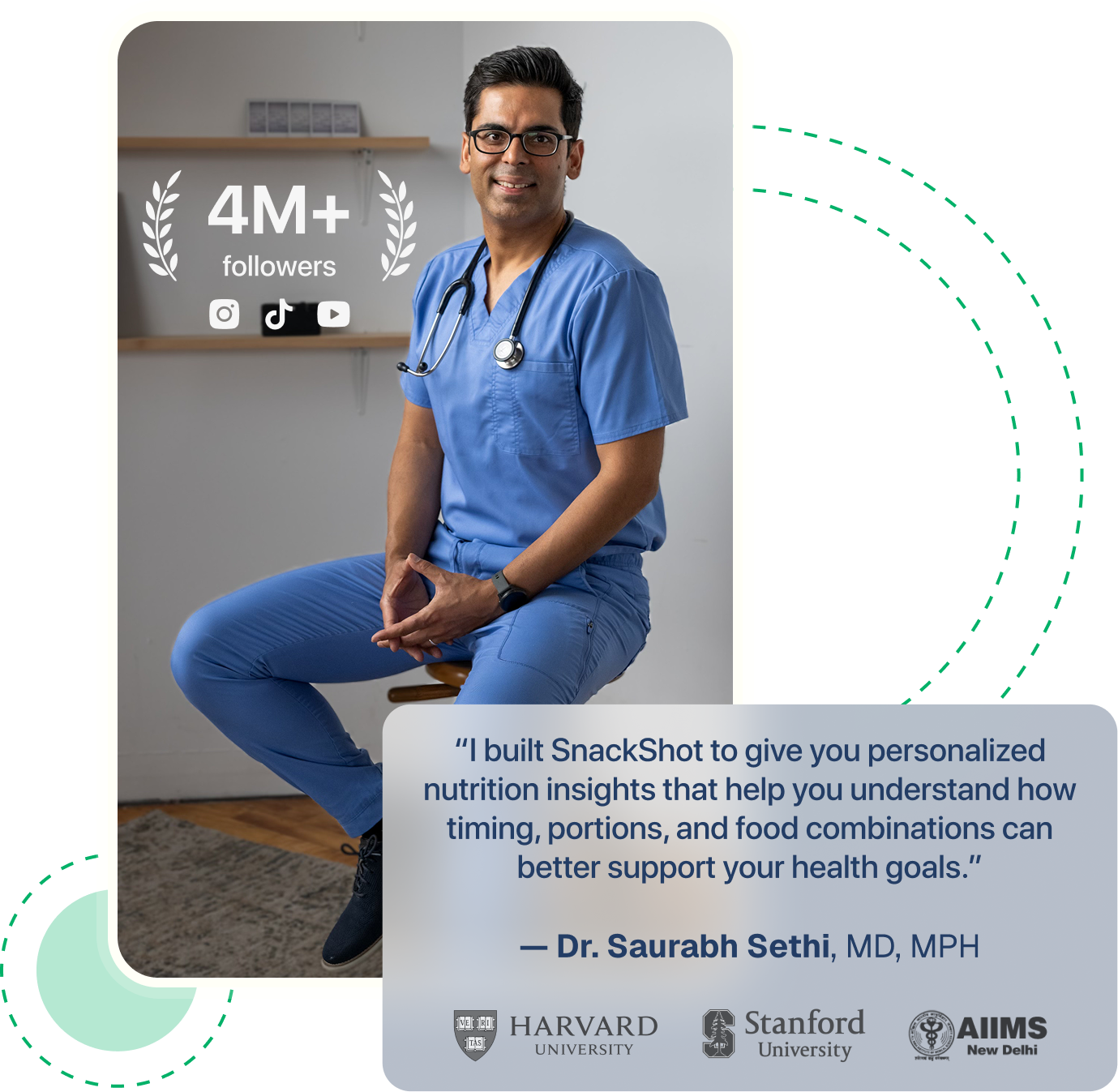 With 25 years of experience as a gastroenterologist, 25,000+ patients seen, and a global community of 4 million, SnackShot is built on Dr. Sethi’s real-world approach to food guidance.